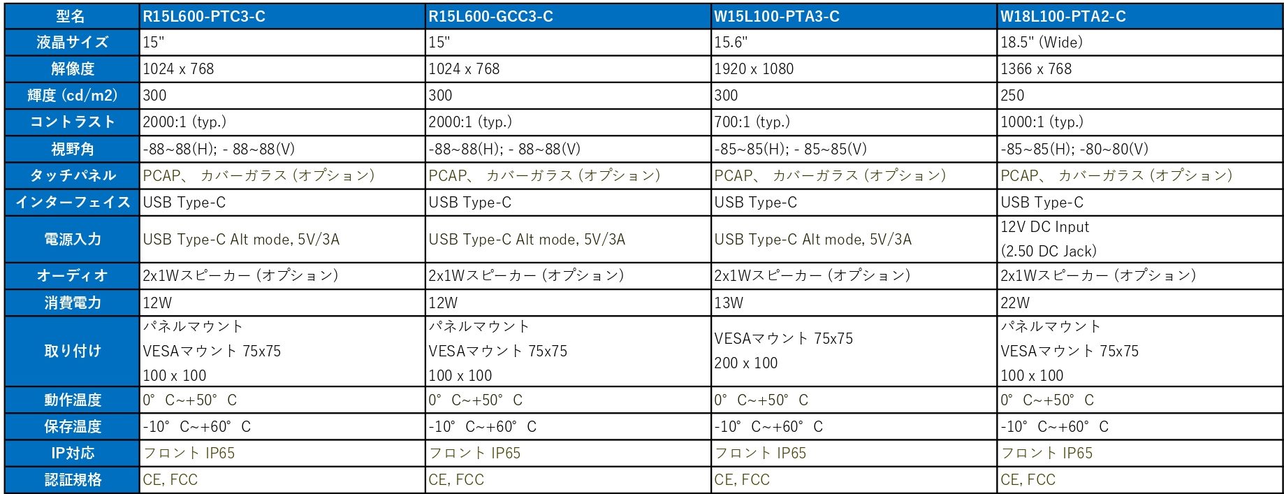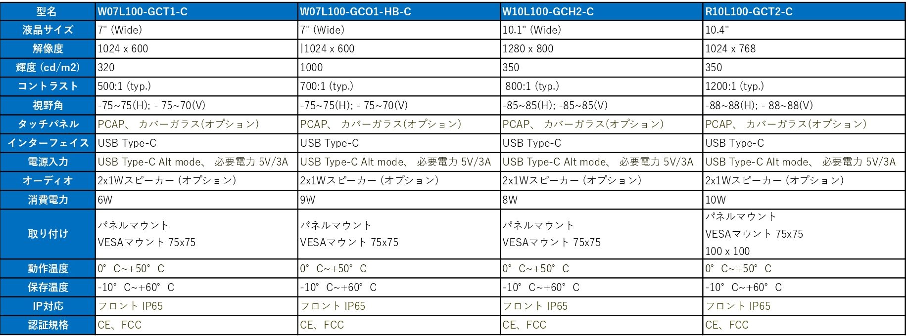 高輝度(800、1000cd/m2)製品もあります。